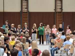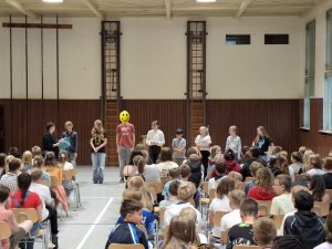 Schülerversammlung – wegen Dauerregen diesmal in der Turnhalle